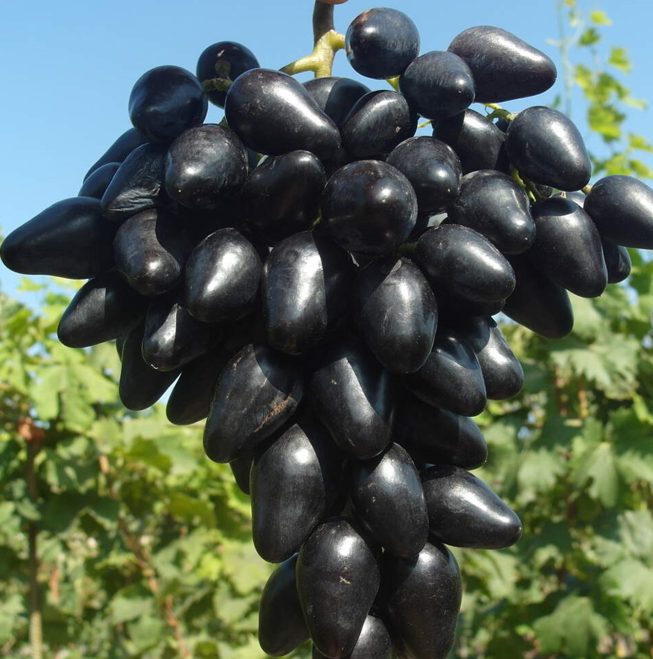 Виноград Чорний кристал, селекції Калугіна В. М. Батьківська пара: Талісман х Велика. Призначення сорту: столовий . Термін дозрівання: Ранній, початок серпня (105 – 115 днів). Сила зростання: Сильнорослий. Квітка: двостатеві. Маса грона: 1000 – 2000 г. Вага ягоди: 15 – 20 грам. Розмір ягоди: 44 х 30 мм. Форма ягоди: Овально – подовжена. Забарвлення ягоди: Чорне. Консистенція м’якоті: Щільна, хрумка. Смак (смак) ягоди: Гармонійний з нотками чорносливу. Сприйнятливість до захворювань: Середня. Стійкість до морозу: – 23 градуси.