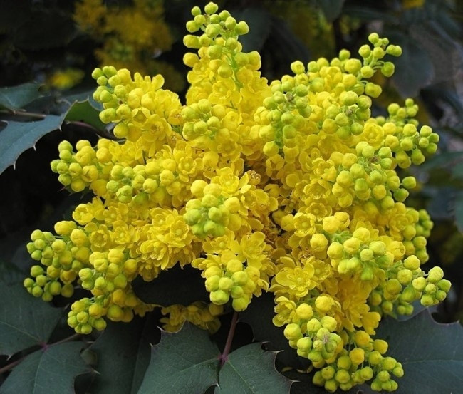 Магонія падуболистна Вічнозелений, почвопокровний, чагарник, що повільно росте. Має інтенсивне цвітіння і компактну крону. Дуже привабливо виглядає навесні, коли рясно цвіте безліччю дрібних яскраво-жовтих кольорів. Чудово виглядає з хвойними рослинами. Утворює хороший ґрунтопокривний килим або низький бордюр. Належить до сімейства барбарисових. Листя велике, шкірясте, блискуче, непарноперисте, з 5-7 колючезубчастих листочків, при розпусканні – червонуваті, влітку – темно-зелені, восени – червонувато-золотисто-бронзові. Квітки жовті, численні, у прямостоячих, сильно розгалужених суцвіттях на кінцях пагонів. Плоди темно-сині, із сизим нальотом. Найкращим часом для посадки буде середина квітня або після плодоношення. Якщо планується формувати щільну групу із саджанців, то відстань між рослинами рекомендується витримувати приблизно 1 м. Коли посадка пухка, цей показник досягає і двох метрів. Пересадку рослина нормально переносить у будь-якому віці. Яма повинна для посадки готуватися не менше 40-50 см завглибшки. При цьому на її дно укладається дренажний шар із керамзиту, гальки або битої цегли. Потім насипається трохи грунтосуміші і ставиться саджанець. Його коренева шийка не заглиблюється, вирівнюється відповідно до поверхні ґрунту на ділянці.